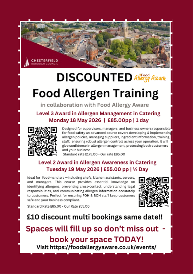 We are currently working with Food Allergy Aware to support food businesses across Chesterfield and as part of this we are providing subsidised accredited allergen training. The following training courses are currently available: