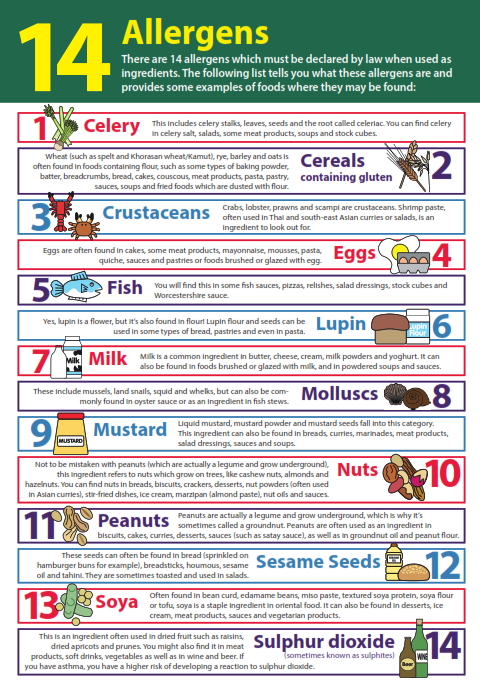 Food law requires information to be provided for the following 14 allergens: